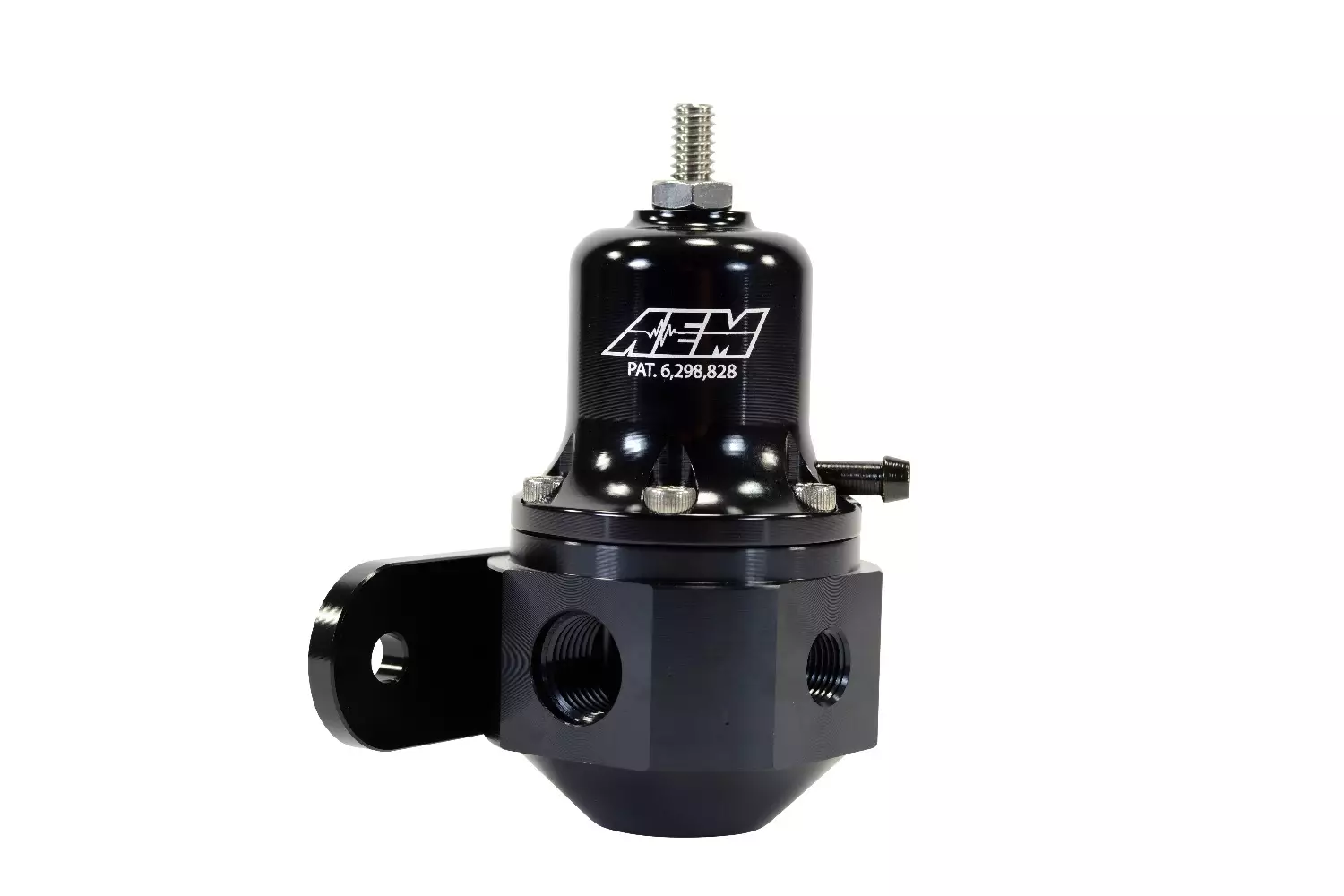 Yleismallinen AEM High Capacity polttoaineen paineensäädin. Pidempi jousi laajempaa säätöaluetta varten. Mustan värinen alumiininen säädin jossa 3xAN6 liitännät polttoainelinjoille sekä 1/8" NPT painemittarille tai paineanturille.